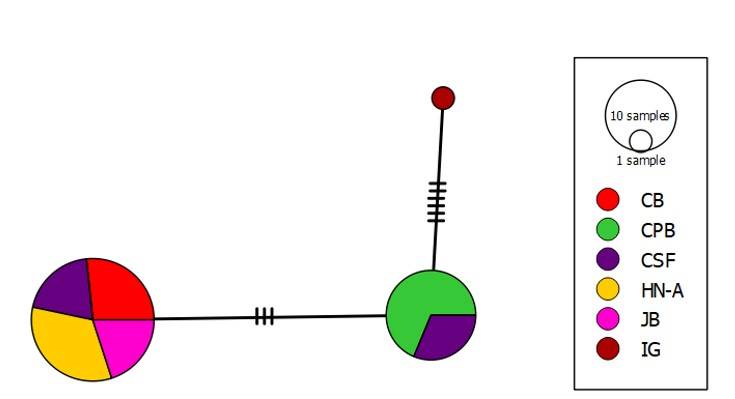 El análisis mostró que el haplotipo uno es compartido por cuatro poblaciones (colores: morado CSF, rojo CB, rosado JB y amarillo HN-A) que reúne 31 secuencias. Mientras que el haplotipo dos posee 16 secuencias procedentes de las poblaciones de CPB (verde) y CSF (morado). El haplotipo tres representa la muestra control de la especie I. guatemalensis (color ocre).