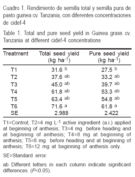 Se concluye que el rendimiento de semilla total y semilla pura de pasto guinea, se mejoró significativamente con la aplicación de la fitohormona esteroidal cidef-4, independientemente de la concentración y momento de aplicación. Sin embargo, los mayores rendimientos de semilla se obtuvieron aplicando de 8 a 12 mg de ingrediente activo por litro de solución de este producto. El efecto positivo de este compuesto en el incremento del rendimiento de semilla, se debe al aumento del número de panículas, número de semillas producidas por panícula y peso de las semillas. La calidad de las semillas, en términos de porcentaje de semilla pura y germinación, no fue mejorada por ninguno de los tratamientos evaluados, por tanto, la aplicación de la fitohormona esteroidal cidef-4, puede ser utilizada como una práctica agronómica para mejorar el rendimiento de semilla del pasto guinea cv. Tanzania.