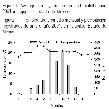 El estudio se realizó en el rancho Ex-Hacienda de Ixtapan, Tejupilco, Estado de México, ubicado a 18° 54' N y 100° 08' O, a 1,320 msnm, en condiciones de temporal, durante el año 2001. El clima del lugar es cálido subhúmedo, con lluvias en verano y una precipitación promedio anual de 1,140 mm, distribuida durante junio a octubre y temperatura media anual de 21 °C(11). La temperatura promedio y precipitación mensual ocurridas durante el año de estudio se presentan en la Figura 1. La temperatura media anual y precipitación total fueron 20.4 °C y 1,618 mm, respectivamente. El suelo es de textura arcillosa, con pH de 5.6, 3.5% de MO, 18.9, 10.5 y 192 mg kg-1 de N, P y K, respectivamente.