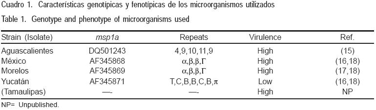 Se utilizaron cinco cepas de A. marginale aisladas de casos clínicos en diferentes estados de México (Cuadro 1), algunas de ellas parcialmente caracterizadas con relación a su virulencia o particularidades de su genoma(15,16,17,18). Las cepas se mantuvieron en congelación a 196 °C y para reactivarlas se inocularon en los bovinos previamente esplenectomizados. Para estimar el porcentaje de eritrocitos infectados (Ei), a partir de una muestra se prepararon dos frotis teñidos con colorante de giemsa(19), observándose al microscopio con objetivo de inmersión 100X, tomando el valor promedio de ambos. Cuando los valores de infección fueron mayores al 10 %, asépticamente se tomó sangre infectada mediante punción en la vena yugular, empleando un matraz Kitasato con perlas de vidrio previamente esterilizado, agitándole mediante rotación para evitar la coagulación. La sangre obtenida se lavó con solución VYM estéril(20), cada lavado consistió en centrifugar a 1,500 xg por 15 min a 4 °C, decantando el sobrenadante y resuspendiendo al 50 % (v/v) en VYM, eliminando la capa flogística. Los inóculos consistieron en eritrocitos infectados suspendidos al 50 % en VYM (v/v) o en su caso, cuerpos iniciales (Ci) que corresponden a los cuerpos de inclusión de A. marginale liberados para facilitar la invasión de las células huésped, obtenidos mediante la aplicación de protocolos de lisis, purificados con gradiente de Percoll®, en presencia o ausencia de fluoruro de fenilmetilsulfonilo (PMSF), como inhibidor de proteasas(21).