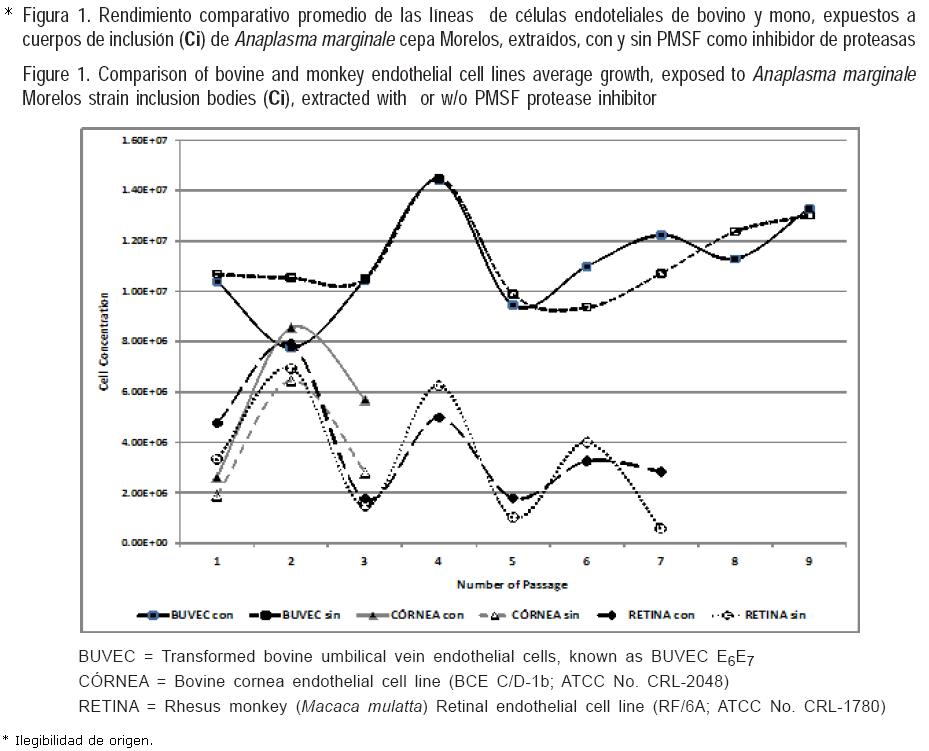 Los resultados de la inoculación de cultivos de células nucleadas con la cepa Morelos, indican un cambio gradual en las formas celulares, principalmente en las células expuestas al inóculo conformado por Ei intactos; estos cambios fueron más radicales conforme se incrementaba el número de pases, se inició en el pase cero y se realizaron al menos cuatro pases, dependiendo de la estirpe celular. Estos cambios consistieron en formas ahusadas pronunciadamente con incremento en el número de gránulos o partículas intracitoplasmáticas, características más evidentes en las líneas RF/6A y BCE. En el resto de los inóculos se mantuvieron las características morfológicas sin cambios aparentes, a lo largo del ensayo. Todos los cultivos inoculados con los Ei sometidos a choque térmico presentaron contaminación bacteriana, razón por la cual se desecharon, al igual que la mayoría de los cultivos de BCE, después del tercer pase. En tanto, las células no expuestas a A. marginale con más de 90 % de confluencia mostraron formas típicas de "mosaico" en las líneas RF/6A y BCE. En cuanto a los rendimientos celulares, en RF/6A se presentó una disminución drástica, conforme el número de pase, en los cultivos expuestos a Ei sonicados, tratados con saponina y Ci con y sin inhibidores de proteasas, siendo constante el rendimiento de las células cultivadas con Ei intactos. En BUVEC se apreciaron diferencias mínimas en forma, tamaño y número de células, entre pases e inóculos, lo mismo ocurrió con BCE y RF/6A. En la Figura 1 se ejemplifica la fluctuación en el crecimiento de estas líneas celulares expuestas a Ci extraídos con o sin PMSF como inhibidor de proteasas.