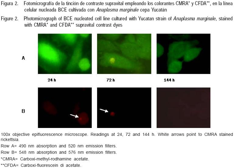 Los resultados del tercer ensayo orientado a observar el contraste entre la línea celular BCE y la cepa Yucatán de A. marginale con la tinción supravital, en la primera lectura a las 24 h, se pudieron apreciar las formas celulares bien definidas, los eritrocitos contenían al A. marginale en su interior. Al sobreponer los filtros del microscopio, para CFDA y CMRA, los Ei aparentemente se encontraban en contacto cercano con las células endoteliales. Este mismo patrón se observó en la segunda la lectura, a las 72 h, sin embargo, la intensidad de los colorantes disminuyó drásticamente dificultando la visualización. La última lectura, a las 144 h ambos colorantes mostraban menor intensidad, principalmente CMRA (Figura 2).