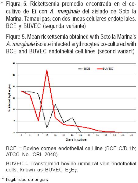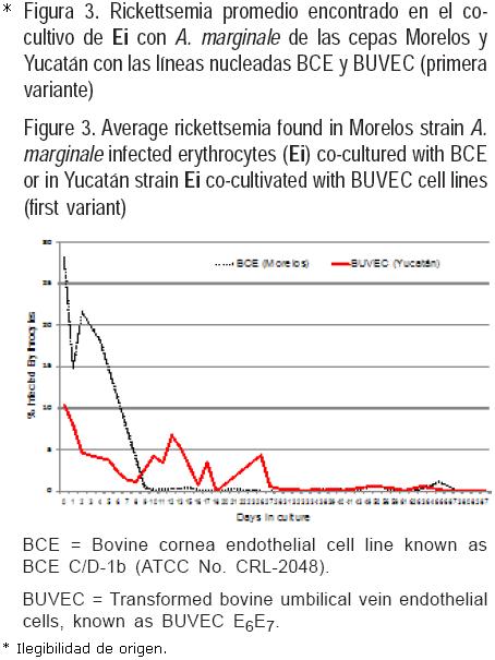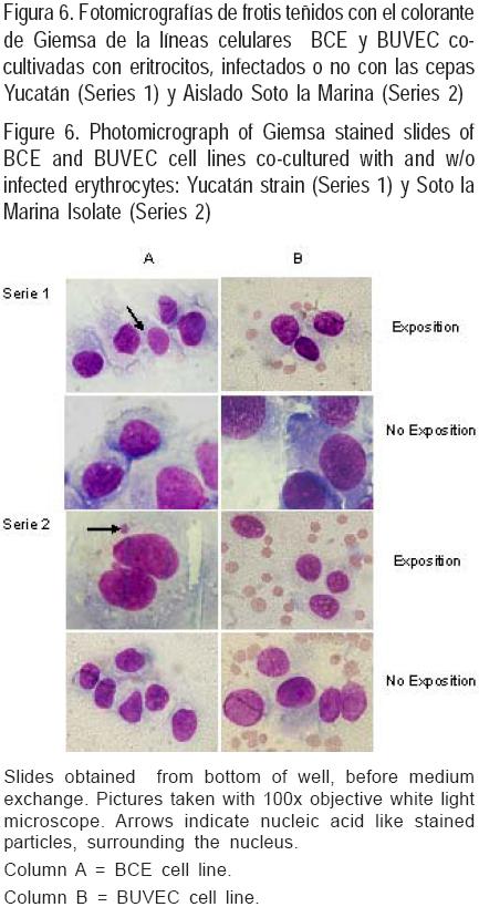 Ensayo 4. La metodología de cocultivo fue similar a la empleada por Waghela y colaboradores(33), con algunas modificaciones. La finalidad de este estudio fue sembrar con Ei intactos, las líneas celulares endoteliales no expuestas, adicionando periódicamente eritrocitos no infectados. Las líneas BUVEC y BCE fueron utilizadas en cocultivo con las cepas Morelos y Yucatán (primera variante) y con el aislado Tamaulipas (Soto la Marina) y la cepa Yucatán (segunda variante). Estos inóculos se obtuvieron de bovinos esplenectomizados. La siembra se hizo por duplicado en placas de 24 pozos. Cada placa se dividió en tres grupos: testigo, con Ei y con eritrocitos no infectados. En la primera variante, después de la inoculación de los monoestratos celulares con 1.25 ml de Ei, el cambio de medio se realizó sustrayendo y reconstituyendo 1.0 ml del medio de cultivo cada 24 h. El subcultivo, se hizo semanalmente y 24 h después se adicionaron 25 μl de eritrocitos no infectados al 50 % en VYM, a todos los pozos exceptuando el grupo testigo. Antes de cada cambio de medio se realizó un conteo de la proporción de eritrocitos infectados, mediante frotis teñidos con giemsa. Para la segunda variante, se colocó un cubreobjetos en el fondo de los pozos de las placas, la inoculación y cambio de medio fue a los mismos intervalos que en la primera variante. Semanalmente se llevaron a cabo los pases, retirando el material suspendido en el medio de cultivo y agregándolo a un nuevo pozo con un monoestrato de células endoteliales previamente sembradas y sin infectar. Se realizó el conteo de rickettsemia con frotis teñidos antes de cada cambio de medio, los cubreobjetos del fondo de los pozos se tiñeron con giemsa o se prepararon para inmunofluorescencia.