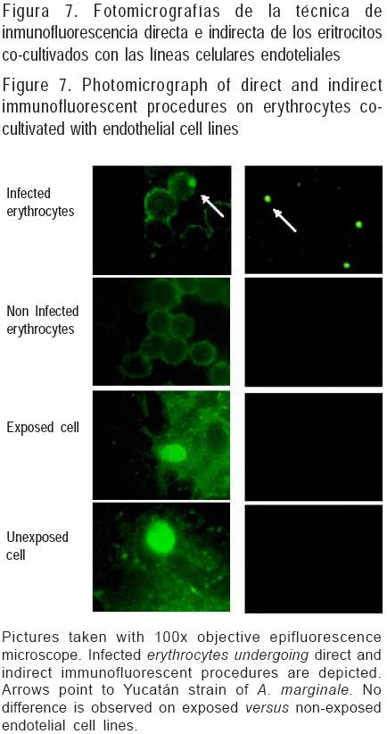 La técnica de IF indirecta aplicada a las células endoteliales cocultivadas con eritrocitos infectados arrojó resultados insatisfactorios, los anticuerpos monoclonales no reconocieron a las proteínas de superficie de A. marginale, posiblemente porque durante el cultivo hubo cambios de conformación en algunas de ellas que interactuaban con los eritrocitos y las células nucleadas. De hecho existen evidencias que muestran que presentan alteraciones en las características infectivas de esta rickettsia(37). Pese a que se logra la demostración de la bacteria en las células hospederas al momento de inocularse en bovinos susceptibles, no se presenta anaplasmosis clínica o diferencias en la respuesta de anticuerpos específicos(38), cuando se comparan con los testigos inoculados con células no expuestas a la rickettsia. Otros estudios han demostrado que 10 μl de sangre infectada podrían ser suficientes para infectar a un animal adulto susceptible e inclusive causarle la muerte(39) y que no ocurrió en este trabajo.