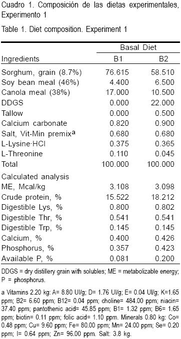 Se usaron 30 cerdos machos castrados productos de un cruzamiento PIC337 x (Landrace x Duroc) con un peso inicial de 50 kg, aproximadamente. Se formularon dos dietas basales: la dieta B1 se formuló con sorgo, pasta de soya, pasta de canola, y F (750 FTU/kg) y la dieta B2 incluyó además de los ingredientes anteriores GSDS (Cuadro 1). Quedando las dietas experimentales (Tratamientos) conformados de la siguiente manera: 1) B1 + F, 2) B1 + F + PGH, 3) B2 + F, 4) B2 + F + PGH, 5) B2 + F + X, y 6) B2 + F + PGH + X.