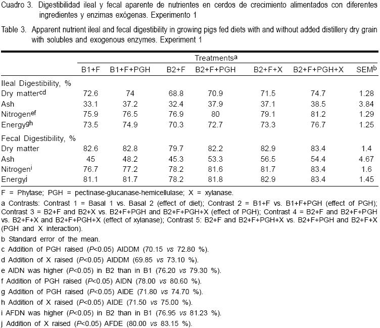 Los efectos encontrados con la adición de PGH coinciden con reportes previos13,24,25(). Aunque es evidente que la composición de la materia prima resulta elemental para la efectividad de una u otra actividad enzimática, es también relevante la susceptibilidad del sustrato para ser hidrolizado. Quizá se debe considerar la posibilidad de que en el proceso de producción de etanol se hayan usado xilanasas (u otras enzimas con actividad celulolítica) para aumentar el rendimiento de alcohol, por lo tanto el subproducto debe haber quedado parcialmente hidrolizado con una mayor susceptibilidad a la acción ulterior de estas enzimas. La falta de efecto de la presencia de +F + X sobre la digestibilidad del N coincide con los autores mencionados previamente.
