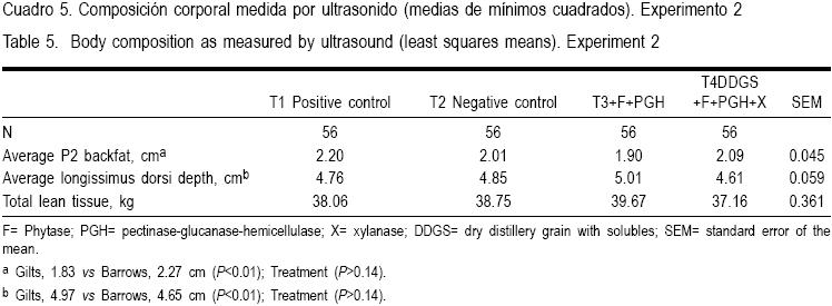 Cuando los cerdos alcanzaron un peso promedio aproximado de 100 kg (al día 52), se escanearon con un equipo de ultrasonido en tiempo real, usando un transductor de 17.5 mm y 3.5 MHz, registrándose las profundidades de grasa dorsal y del músculo largo dorsal, en el punto P2 y a la altura de la 10ª y última costilla. Con estas variables y con el peso corporal (al día 49), se estimó el tejido magro libre de grasa. Veinticuatro horas después de terminado el experimento, y luego de un ayuno de 12 h, los cerdos se embarcaron para ser transportados por 157 km a su sacrificio comercial en un rastro TIF; las canales se despiezaron después de 24 h a 4 °C.
