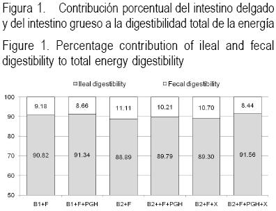 Considerando que la digestibilidad ileal representa la capacidad del animal para extraer la energía de los alimentos por medio de los procesos enzimáticos, y la digestibilidad fecal incluye además la fermentación de los sustratos no digeridos por medio de la flora microbiana presente en el ciego, es evidente que la adición de PGH a la dieta B1 y la adición de +PGH y +X a la dieta B2 incrementó ligeramente la digestión de la energía en intestino delgado. El cambio en el sitio de digestión de la energía fue más evidente con la adición de +PGH y +X a la dieta B2 ya que hubo un incremento de 2.7 puntos porcentuales en la liberación de energía en el intestino delgado (Figura 1).