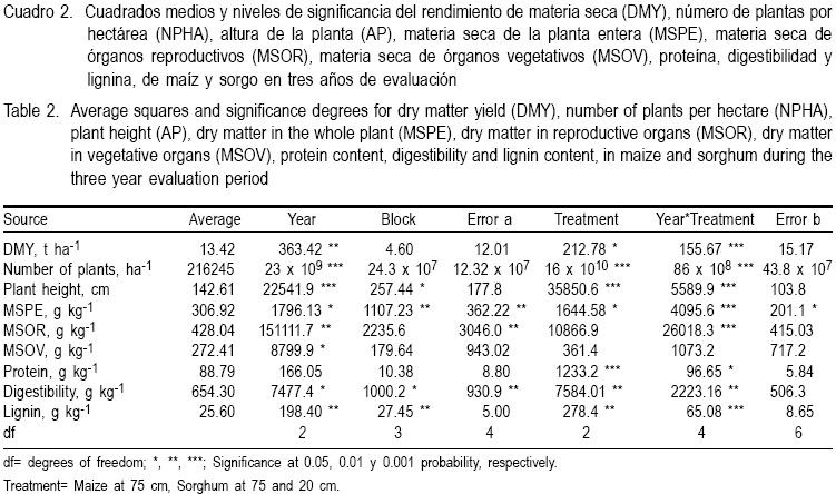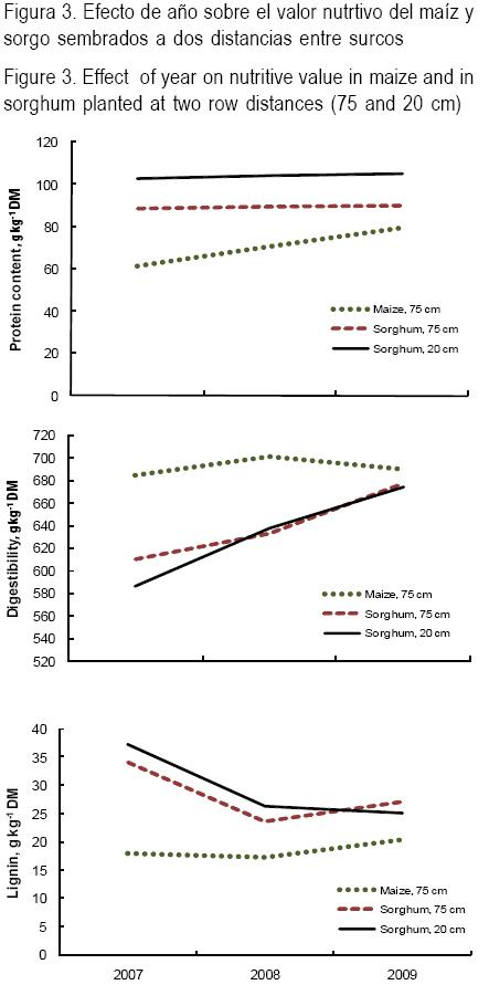 Aún cuando hubo interacción año x tratamiento para los tres caracteres del valor nutritivo (Cuadro 2), la magnitud de los cambios fue baja (P>0.05) dado que tanto el maíz como el sorgo a 75 y 20 cm mantuvieron sus concentraciones de proteína, digestibilidad y lignina entre los diferentes años (Figura 3).