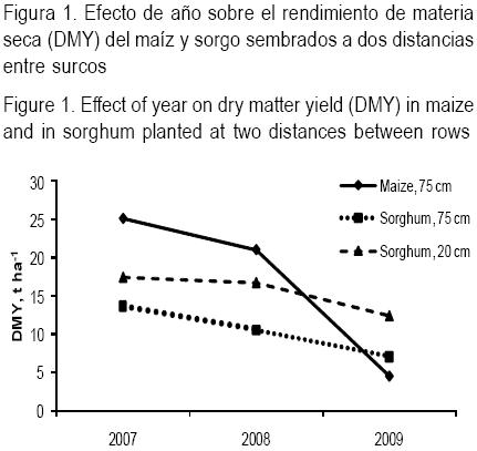 El objetivo fue comparar el rendimiento de materia seca y el valor nutritivo de un híbrido convencional de sorgo [(Sorghum bicolor (L.)], establecido a dos distancias entre surcos, con un híbrido convencional de maíz (Zea mays L.). El sorgo var. Solarius fue establecido a 75 y 20 cm entre surcos, y el maíz var. Anjou 387 a 75 cm (siembra convencional) en 2007, 2008 y 2009 en Lusignan, Francia. El rendimiento de materia seca (RMS) en ambas especies declinó con los años y esta disminución fue mayor en maíz. El RMS para 2009 fue menor en 20.7, 6.5 y 5 t ha-1, al compararlo con 2007, con respecto a maíz, sorgo 75 y 20 cm, lo que indica que la reducción de lluvia afectó menos el RMS del sorgo 20-cm. Al promediar los años, sorgo 20-cm tuvo mayor proteína con 104.1 g kg-1 MS vs 89.4 y 70.5 g kg-1 MS de sorgo 75-cm y maíz, respectivamente. El maíz tuvo más alta digestibilidad que el promedio de los dos tratamientos de sorgo con 692 vs 636 g kg-1 MS. La digestibilidad fue mayor en maíz debido a su menor concentración de lignina. La concentración en lignina del maíz fue 18 vs 28.8 g kg-1 MS del promedio de los dos tratamientos de sorgo. Sin embargo, la digestibilidad de ambos tratamientos de sorgo aumentó en 77.2 g kg-1 MS al pasar de 2007 a 2009. El maíz fue más sensible a los cambios ambientales. El sorgo sembrado a 20 cm entre surcos fue superior en RMS y en concentración de proteína que el maíz, cuando las condiciones de lluvia son un factor limitante.