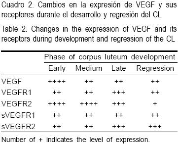 Todo lo anterior sugiere que el sistema VEGF es necesario no sólo para la angiogénesis inicial del CL durante su desarrollo, sino también para el mantenimiento de su función. En adición, durante la lisis del CL el sistema VEGF parece ser desestabilizado para evitar su acción y favorecer la regresión del CL. En el Cuadro 2 se muestran los cambios en la expresión relativa de VEGF y sus receptores durante la fase lútea temprana, media, tardía y en la regresión del CL.