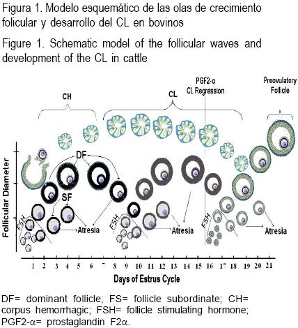 El desarrollo folicular que se presenta en el ciclo estral/menstrual, ocurre en forma de ondas u olas, conformadas por cohortes o grupos de folículos que durante el reclutamiento inicial, son elegidos para continuar su crecimiento en respuesta a gonadotropinas (reclutamiento cíclico)(41,42). En cada ola, se establece entre los folículos reclutados una competencia por la dominancia, en la cual uno o varios folículos (dependiendo de la especie) de la cohorte adquiere el desarrollo competente que le permitirá seguir creciendo en un ambiente de bajas concentraciones de gonadotropinas, al tiempo en que sus compañeros de cohorte sufren atresia. El folículo dominante modifica el patrón de crecimiento de los folículos subordinados en ambos ovarios, mediante la producción de estradiol e inhibina que actúan en forma endocrina, autocrina o paracrina para autopotenciar su desarrollo e inhibir el de los subordinados. En las especies monotocas el folículo dominante de la primera ola del ciclo, emerge mientras está activo el CL, de tal manera que la progesterona secretada por esta glándula transitoria, reduce la frecuencia de pulsos de LH, evitando su ovulación y provocándole atresia. Lo mismo ocurrirá con todos los folículos dominantes que aparezcan durante la fase lútea del ciclo. El folículo dominante que se desarrolle en la fase folicular del ciclo será estimulado por la frecuencia alta de pulsos de LH para terminar su maduración y ovular(43,44). En la Figura 1 se muestra el esquema clásico de desarrollo folicular en una vaca con tres olas de crecimiento, donde sólo el folículo de la última ola podrá ovular.