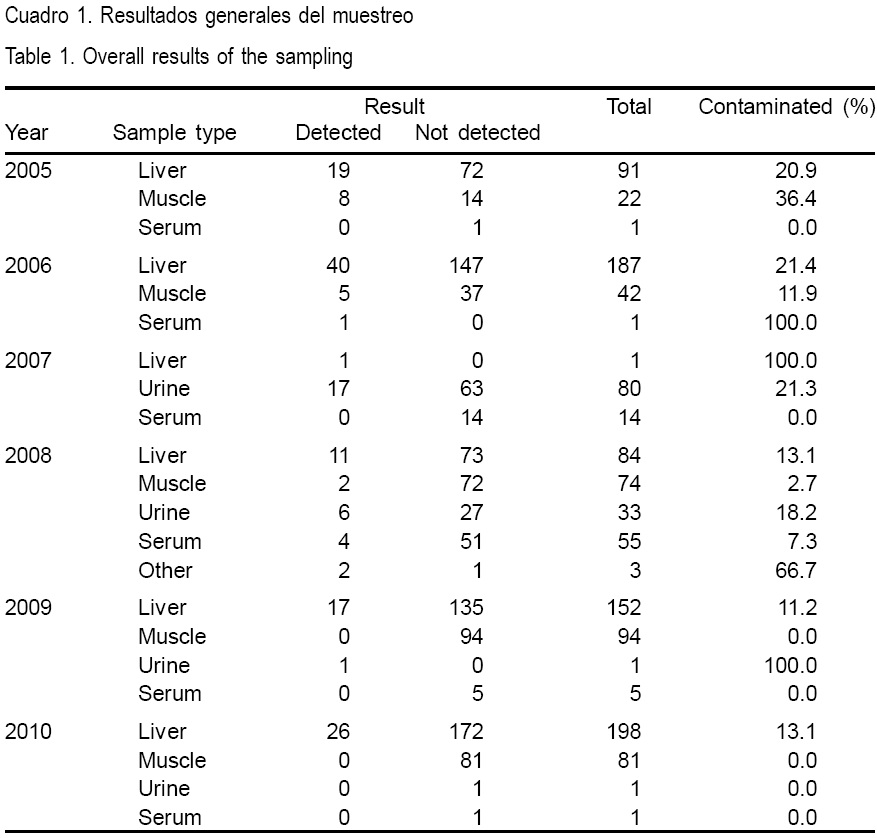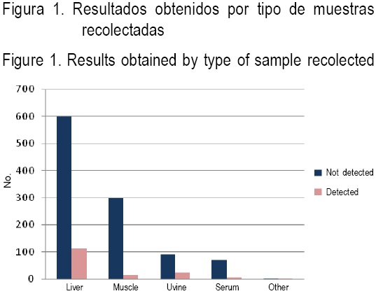 Durante el periodo de estudio, se recolectaron 1,221 muestras, de las cuales en su mayoría fueron de hígado (n= 713) (Figura 1). El porcentaje de muestras contaminadas con relación al tipo de matriz biológica fue superior en orina (20.9 %), le siguió el hígado (16.0 %), suero (6.5 %) y, por último, el músculo (4.8 %) (Cuadro 1); estos resultados son consistentes con estudios previos que demuestran que la orina es la principal vía de excreción de bovinos y otros modelos animales, y que el hígado es un órgano que absorbe de manera eficaz el clembuterol después de haber sido adminis trado(1 7-1 9); no obstante, deberá confirmarse la idoneidad del uso de estas matrices biológicas para la vigilancia sanitaria del clembuterol mediante estudios de correlación.