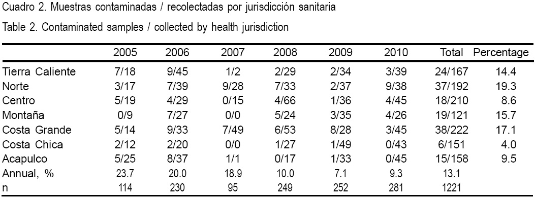 Los casos de muestras contaminadas se encontraron por todas las regiones de Guerrero, siendo las jurisdicciones sanitarias Norte y Costa Grande las que presentaron cantidades más grandes con 37 (19.3 %) y 38 (17.1 %) casos, respectivamente, seguidas por Tierra Caliente y Montaña, con 24 (14.4 %) y 19 (15.7 %) cada una (Cuadro 2); la Costa Chica solamente presentó 6 durante el periodo. El tamaño del muestreo fue variable entre las jurisdicciones, con una escala que fue desde 1 21 en la Montaña hasta 222 especímenes recolectados en la Costa Grande; esta situación se explica por el hecho de que las visitas de verificación sanitaria fueron más frecuentes en aquellos municipios que registraron una mayor presencia del fármaco; de la misma manera, solamente los años 2006, 2008, 2009 y 2010 guardaron cierta similitud en la cantidad de muestras recolectadas, en el 2007 fue menor en tanto que el 2010 fue el año en el cual se intensificó la vigilancia con un total de 281.
