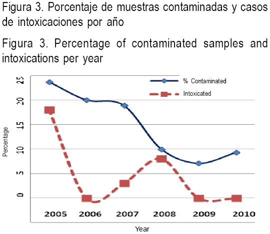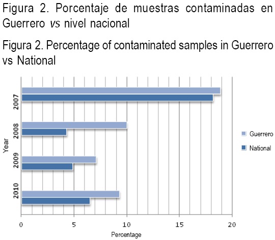 En términos generales, se detectaron 160 muestras contaminadas (13.1 %) en todo el periodo (Cuadro 2). La tendencia observada fue de tipo descendente (Figura 2), en el año 2005 se obtuvo el valor más alto (23.7 %), aunque en cifras absolutas el 2006 registró la mayor cantidad (46 contaminadas); a partir de este año comenzó a disminuir gradualmente, y para el 2008 se redujo este porcentaje a la mitad respecto a años anteriores y disminuyó aún más en el año 2009; finalmente en el 2010 aumentó levemente concluyendo en 9.3 %. Estos datos se correlacionan fuertemente con los valores promedio obtenidos a nivel nacional en el periodo de 2007 a 2010 (r= 0.962); en la comparación de medias existió una diferencia significativa entre el porcentaje de Guerrero (11.3 %) y el de nivel nacional (8.5 %) (P<0.05).