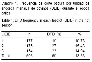 La frecuencia promedio de carne DFD registrado en el período de estudio fue de 13.64 %; los valores de esta condición en cada UEIB se muestran en el Cuadro 1. El valor observado en el presente trabajo, es mayor al refierido por otros autores con valores de 1.7 % en climas fríos reportado en Estados Unidos(18) y de 2.79 % en Francia con temperatura ambiente promedio de 18 °C(19), pero menor al 15.71 % observado en ganado bovino sacrificado a temperaturas ambientales promedio de 35 °C en España(4). La variación en estos resultados, puede estar relacionada con las prácticas particulares de manejo de los animales en los sistemas de producción bajo climas desérticos, además de los efectos propios del verano en el Valle de Mexicali.
