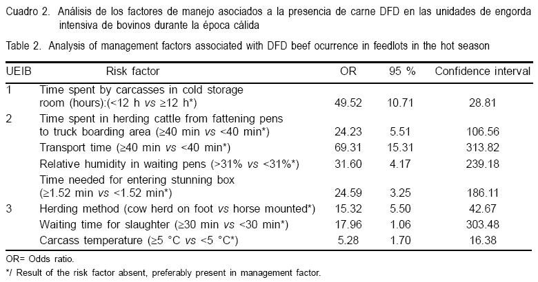 In evaluating management factors associated to presence of DFD beef in the hot dry season, a set of surveys were taken in three feedlots and in one federally inspected slaughter plant in Mexicali, México. The present study was performed on a sample of 506 carcasses, and the L. dorsi muscle in each one of them was tested for pH and color (L*,a*,b*) for grading quality. In the independent frequency distribution test of dark meat (DFD) by management variable, a Chi-squared test was used with Odds Ratio (OR) as association measure at 95 % CI. DFD presence found due to management factors was 13.64 %. Time spent and way of driving cattle , transportation time from feedlot to slaughter plant, relative humidity in waiting pens, waiting time in shuttle and conduction aisle to the stunning box, time spent by carcasses in cold storage room and carcass temperature are factors associated to presence of DFD meat (P<0.05). As a suggestion, special attention should be given to staff training for better performance of their respective duties for improving beef quality, as well as keeping carcasses for at least 24 h in the cold storage room before being marketed.