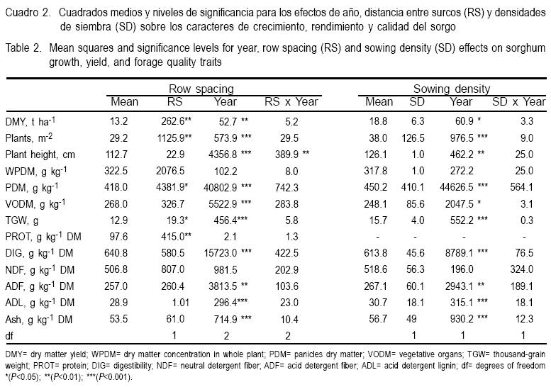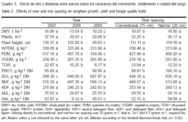 El año y espaciamiento entre surcos fueron fuentes de variación del RMS y de los caracteres de calidad del forraje, sin encontrar interacción entre estos dos factores. Diferencias en condiciones climáticas indujeron variación en altura de planta, plantas/m2 y concentración de MSP, que fueron los caracteres más estrechamente correlacionados con el RMS durante los tres años de estudio. Las diferencias ambientales entre años también afectaron la digestibilidad del sorgo, la cual estuvo asociada inversamente con la variación de los caracteres: LDA, concentración de cenizas en la planta y PMG. No se observaron diferencias en RMS ni en calidad del forraje de sorgo entre las dos densidades de siembra evaluadas (33 vs 65 semillas/m2) en el espaciamiento estrecho entre surcos (20 cm entre surcos) indicando que la siembra de sorgo a alta densidad no presenta ventajas productivas. Por lo anterior, el sorgo sembrado en espaciamiento convencional (75 cm entre surcos) no mejora el RMS, pero sembrado en surcos estrechos a una baja densidad de siembra (33 semillas/m2) incrementa el rendimiento de materia seca y la concentración de proteína del forraje de sorgo.