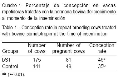 Se probó si una sola inyección de la hormona bovina del crecimiento (bST) al momento de la inseminación aumenta el porcentaje de concepción en vacas Holstein repetidoras. Se utilizaron 316 vacas repetidoras (vacas con > 3 servicios infértiles); al momento de la inseminación se dividieron aleatoriamente en dos grupos: grupo bST (n=175), recibió 500 mg sc de bST al momento de la inseminación. El grupo testigo (n=141), no recibió bST. El diagnóstico de gestación se realizó por palpación rectal 45 ± 3 días después de la IA. Para conocer el efecto de la bST en las concentraciones plasmáticas de IGF-1 y progesterona, se obtuvieron muestras sanguíneas diariamente a partir de la inseminación hasta el día 10 posinseminación en siete vacas tratadas con bST y siete testigos. El tratamiento con bST incrementó el porcentaje de concepción [81/175 (46 %) vs 49/141 (35 %)]; P<0.01). Las concentraciones de IGF-1 fueron mayores (P<0.001) en las vacas que recibieron bST que en las testigo. Las concentraciones de progesterona fueron similares entre los grupos (P=0.68). Se concluye que una sola inyección de la hormona bovina del crecimiento al momento de la inseminación incrementa el porcentaje de concepción en vacas Holstein repetidoras.