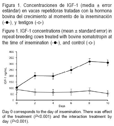 El tratamiento con bST incrementó (P<0.01) el porcentaje de concepción (46 vs 35 %; Cuadro 1). El mejoramiento de la fertilidad en las vacas repetidoras se puede explicar por los efectos directos e indirectos de la bST en la maduración del ovocito, fertilización y desarrollo embrionario temprano. En el presente estudio, las concentraciones de IGF-1 se incrementaron después del tratamiento y se mantuvieron elevadas hasta el último día del muestreo (interacción tratamiento x día P<0.001; Figura 1). Aunque no se midieron las concentraciones de somatotropina, se asume que éstas fueron elevadas debido a que las vacas la recibieron exógenamente; además, hay evidencia de que las concentraciones sanguíneas de IGF-1 comienzan a incrementarse de 5 a 7 h después de la inyección de bST(21), por lo cual la inyección de bST pudo favorecer la maduración final del ovocito. La adición de GH o IGF-1 al medio de cultivo in vitro, favorece la maduración del ovocito e incrementa la proporción de embriones que llegan a dividirse(22-23). En estudios in vivo, también la administración de bST al momento de la inseminación en vacas lecheras(12) incremental a proporción de ovocitos fertilizados. En el presente estudio, el tratamiento con bST pudo influir en la maduración del ovocito, dando como resultado un ovocito con mayor potencial para ser fertilizado y para desarrollar un embrión viable.