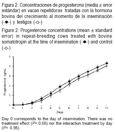 Se ha sugerido(3,4) que otra forma en que la bST puede favorecer la sobrevivencia embrionaria podría ser por medio del mejoramiento de la función del cuerpo lúteo. En condiciones in vitro, el IGF-1 incrementa la producción de progesterona en el tejido lúteo(25). Además, se ha encontrado que las vacas tratadas con bST tienen concentraciones más elevadas de progesterona(14). No obstante, en el presente trabajo el tratamiento con bST no aumentó (P=0.68) las concentraciones sanguíneas de progesterona (Figura 2), por lo cual el mecanismo de acción de la bST puede ser independiente a la estimulación de la función del cuerpo lúteo.