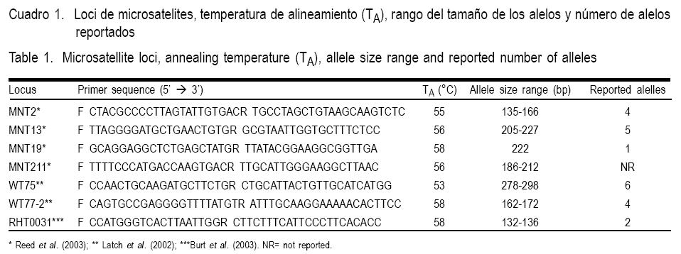 Se realizó extracción de ADN mediante el método libre de fenol descrito por Fitz-Simmons(11). Los ensayos de PCR se llevaron a cabo con oligonucleótidos para siete loci de secuencias simples repetidas (SSR), descritos previamente(12,13,14) (Cuadro 1). La amplificación se realizó en un volumen total de 25 μl; cada mezcla de reacción contenía 20-30 ng de ADN, 10 pmol de cada iniciador, 1X de amortiguador para PCR sin MgCl2 (Invitrogen), 200 μM de cada dNTP, 0.75-1.25 mM MgCl2, 0.3 U Platinum Taq ADN polimerasa (Invitrogen) y H2O destilada, desionizada, estéril. Las condiciones de la PCR fueron como sigue: desnaturalización a 95 °C durante 5 min seguido por 35 ciclos a 95 °C durante 2 min, 53-58 °C por 2 min y 72 °C durante 2 min, con un periodo de extensión final a 72 °C durante 8-10 min (2700 Applied Biosystems). El análisis de detección se realizó en un AB 3100 Avant Genetic Analyzer (Applied Biosystems). El tamaño del producto se determinó en relación al tamaño del marcador molecular interno Genescan-350ROX (Applied Biosystems). El tamaño de los alelos se determinó usando el software Peak Scanner versión 1.0 (Applied Biosystems).