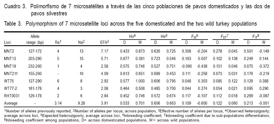 Los valores de Fis a través de los loci de las poblaciones domesticadas y silvestres mostraron las diferencias esperadas, las cuales fueron mayores para pavos domesticados y menores para pavos silvestres. Los valores de Fst sugirieron flujo genético moderado en poblaciones domesticadas y silvestres. Los valores de Fst a través de los loci indicaron que aproximadamente el 12 y 6 % de la variación genética total en pavos domesticados y silvestres, respectivamente, fue explicada por las diferencias en las poblaciones, y 88 y 94 % correspondieron a diferencias dentro de las poblaciones, respectivamente.