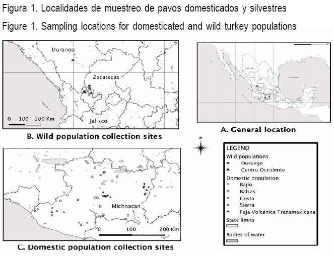 Se usaron cinco poblaciones de pavo domesticado (M. g. gallopavo) originario del centro de México y dos poblaciones silvestres (M. g. mexicana) incluidas como grupo externo.