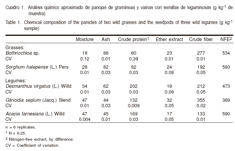 De cada especie seleccionada se analizaron químicamente por las técnicas estandarizadas descritas en AOAC(6): humedad (método 934.01), cenizas (método 942.05), proteína cruda (N x 6.25) (método 976.05), extracto etéreo (método 920.39), fibra cruda (método 962.09) y extracto libre de nitrógeno (carbohidratos solubles) por diferencia. Fracciones de fibra por los métodos descritos por Van Soest(7): fibra detergente neutro (FDN), fibra detergente ácido (FDA), lignina, celulosa, hemicelulosa y sílice. Factores antinutricios: inhibidor de tripsina(8), hemaglutininas (prueba cualitativa)(9), saponinas (prueba cualitativa)(10), minerales por espectrofotometría de absorción atómica(6), perfil de aminoácidos (Waters Acc-QTAG, 1993) y vitaminas: tiamina (método 953.17), riboflavina (método 970.65) y niacina (método 975.41)(6).