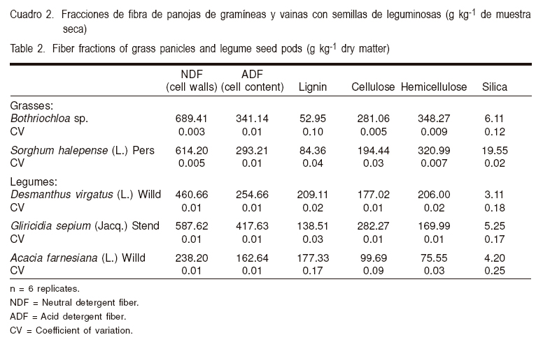 En cuanto a las fracciones de fibra (Cuadro 2) (se reportan en gramos por kilogramos de materia seca) las gramíneas presentan el mayor contenido de FDN o paredes celulares (614 a 689), para FDA (293 a 341), lignina (53 a 84), celulosa (194 a 281), hemicelulosa (321a 348) y sílice (6 a 20). Con respecto a las leguminosas FDN (238 a 588), FDA (162 a 417), lignina (138 a 209), celulosa (100 a 282), hemicelulosa (76 a 206) y sílice (3 a 5).
