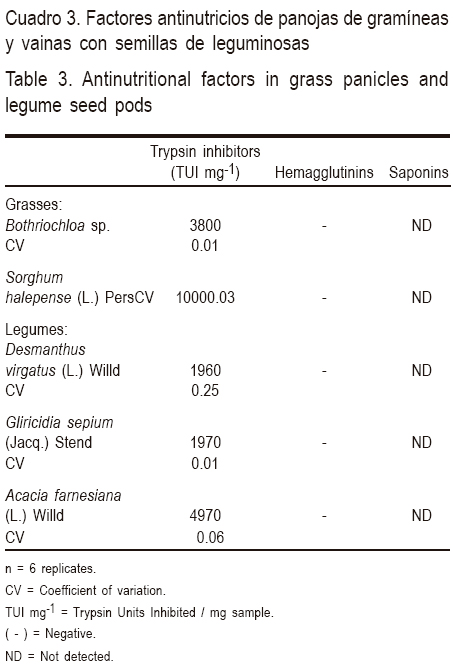 Los valores reportados para el inhibidor de tripsina en gramíneas fueron de 1,000 a 3,800 y en leguminosas de 1,960 a 4,970 UIT mg-1. En ambos grupos de muestras la prueba de hemaglutininas dio negativa, y no se detectaron saponinas (Cuadro 3).
