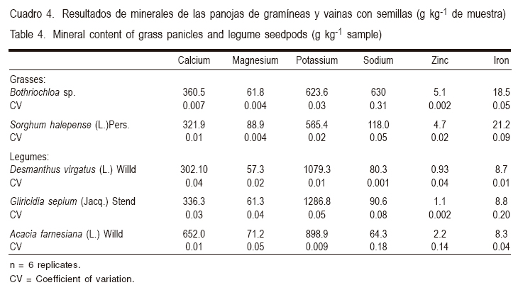 En las gramíneas el contenido de minerales (gramos por kilogramo) fue: Ca (322 a 360), Mg (62 a 89), K (565 a 623), Na (565 a 630), Zn (4.7 a 5.1) y Fe (18 a 21) y en leguminosas: Ca (302 a 652), Mg (57 a 71), K (899 a 1287), Na (64 a 91), Zn (0.9 a 2.2) y Fe (8.3 a 8.8) (Cuadro 4).