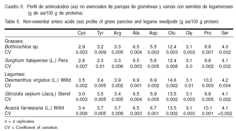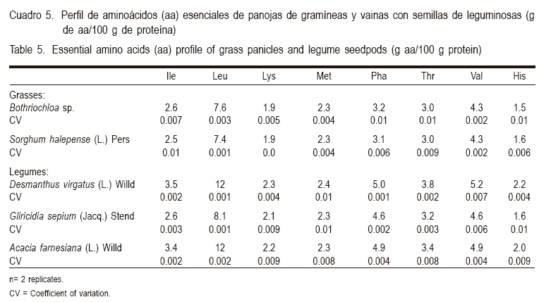 Se reporta el contenido de 8 aminoácidos esenciales (Cuadro 5) y 9 no esenciales (Cuadro 6) y tres vitaminas hidrosolubles (Cuadro 7) siendo similares los resultados tanto para gramíneas como para leguminosas.
