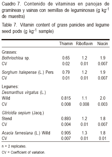 El perfil de aminoácidos en 100 g de proteína fue similar en gramíneas y leguminosas, aunque el contenido de proteína fue mayor en las leguminosas. Esta información puede ser de utilidad en la formulación de dietas. El contenido de vitaminas hidrosolubles fue similar en ambos grupos.