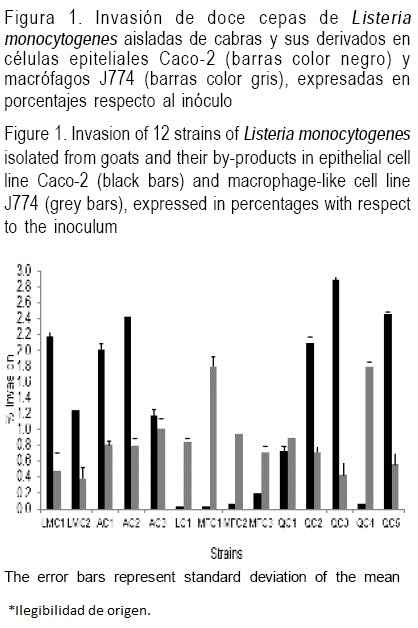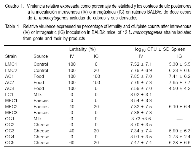 Se evaluó la virulencia de cepas de Listeria monocytogenes todas de serotipo 4b procedentes de cabras y sus derivados. Se observaron niveles de virulencia variables cuando se comparó la virulencia relativa (porcentaje de letalidad) en ratones BALB/c inoculados vía intravenosa o intragástrica y su capacidad para infectar macrófagos J774A.1, y células epiteliales Caco-2. Dos cepas obtenidas de alimento de cabras produjeron 100 % de letalidad por ambas vías de inoculación y no mostraron diferencia significativa con la cepa testigo (P>0.05) respecto al porcentaje de invasión y a los parámetros de la cinética de crecimiento cuadrática observada en ambas líneas celulares. Si bien todas las cepas lograron invadir las células Caco-2, solamente algunas consiguieron invadir el bazo después de la inoculación por vía intragástrica. Las dos cepas provenientes de alimento de cabras fueron las más virulentas, representando un riesgo para la salud humana y animal, ya que pueden ser diseminadas en el hato y de este a otras explotaciones o a las instalaciones donde se elaboran alimentos.