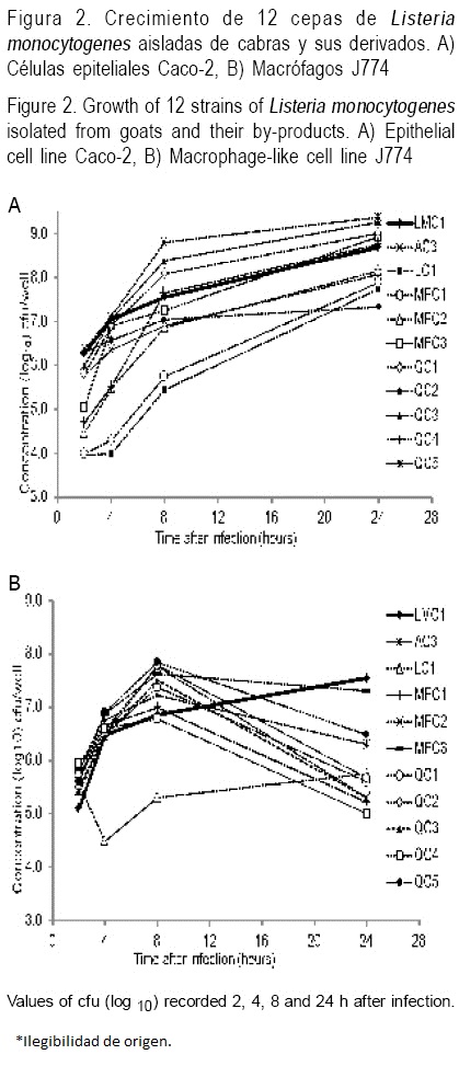 Un contribuyente principal a la virulencia de L. monocytogenes es su habilidad para invadir y replicarse dentro de una amplia variedad de células eucariotas(18,20). Las bacterias generalmente crecen de manera exponencial(38,39); sin embargo en este trabajo se encontró que las cepas evaluadas de L. monocytogenes mostraron un crecimiento polinomial de segundo grado en las líneas celulares macrófagos J774 y Caco-2. En los resultados de los ensayos in vitro, se observó que las cepas obtenidas de cabras y sus derivados difieren en su habilidad para invadir ambas líneas celulares Caco-2 y los macrófagos, aunque mostraron el mismo potencial de crecimiento dentro de las células. En general se observó una invasividad y crecimiento intracelular ligeramente superior en las células epiteliales Caco-2, mostrando también mayor dispersión en los datos obtenidos respecto a las cepas evaluadas. Nuestros resultados de crecimiento intracelular en ambas líneas celulares concuerdan con los obtenidos en otros estudios, en los cuales las cepas de L. monocytogenes crecen 2-3 log10 (10 a 12 h) en las células Caco-2, comenzando a declinar su crecimiento hacia las 24 h, y en los macrófagos crecen 1.5 a 3 log10 (6 a 14 h), disminuyendo su crecimiento entre 10 y 24 h posteriores a la infección(40,41).