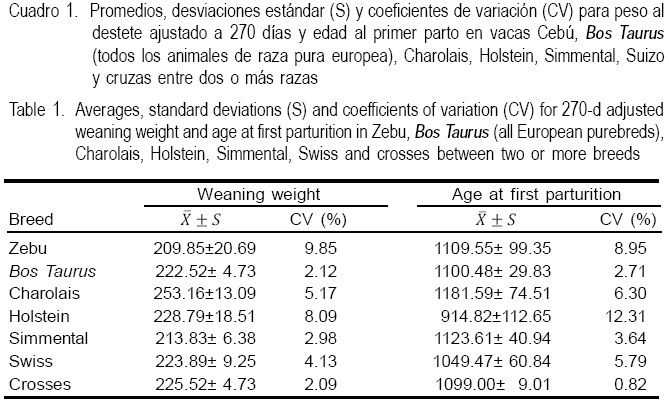 El Cuadro 1 muestra los promedios, desviaciones estándar (S) y coeficientes de variación (CV) para peso al destete ajustado a 270 días y edad al primer parto en vacas Cebú, Bos Taurus (todos los animales de raza pura europea), Charolais, Holstein, Simmental, Suizo y Cruzadas entre dos o más razas. Si bien el análisis de varianza no mostró diferencias (P>0.05) entre la raza cebú con las europeas y las cruzas en ninguna de las variables estudiadas, esto puede deberse a que la variación observada en la raza cebú es cinco veces mayor en peso al destete y tres veces mayor en edad al primer parto con respecto a las razas europeas, así como 11 veces mayor con respecto a las vacas cruzadas, siendo los animales cruzados y europeos más homogéneos en su respuesta.