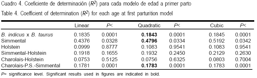 Con respecto a edad a primer parto, los coeficientes de determinación y significancia se muestran en el Cuadro 4. Estos resultados revelan que existe complementariedad entre los genes B. indicus con B. taurus expresado por el modelo cuadrático (R2=0.1843; P<0.0001). Sin embargo, la mayor respuesta a heterosis se observó en la cruza de Cebú x Simmental (R2=0.4796; P<0.0334).