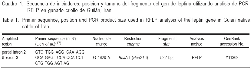 Un fragmento de 522 bp compuesto parcialmente por intrón 2 y el exón 3 del gen leptina se amplificó por PCR usando iniciadores específicos (Cuadro 1), según lo sugerido por Lien et al(17) quienes describieron por primera vez la sustitución de la guanina (G) por adenina (A) en el intrón 2 del gen de leptina de ganado Noruego. Las reacciones de amplificación se realizaron en un volumen final de 25 μl con una concentración final de 50-100 ng de ADN genómico, 1x amortiguador PCR, 10 pmol de cada iniciador, 100 μΜ dNTP Mix, 1.5 mM MgCl2, 1 unidad taq de ADN polimerasa y ddH2O. El perfil térmico del proceso consistió en un paso de desnaturalización inicial por 3 min a 94 °C, seguido de 35 ciclos (desnaturalización a 94 °C por 30 seg, iniciador recalentado a 62 °C durante 35 seg y extensión a 72 °C por 1 min) y una extensión final a 72 °C durante 10 min. Los productos de PCR se separaron y se reconocieron por electroforesis en gel de agarosa al 1.5 % teñido con bromuro de etidio. Los genotipos del gen de leptina se determinaron mediante la técnica de PCR-RFLP. El estudio del polimorfismo del gen de leptina y la digestión de los productos de PCR se realizaron con la enzima de restricción BsaAI (Ppu21I) que identifica secuencias 5' AC"!GT 3'. Fragmentos amplificados fueron digeridos por la enzima BsaAI a 30 °C durante 3 h con la siguiente mezcla reactiva: 8 μl del producto de PCR, 3 μl del amortiguador de digestión 10X, 5 U (0.5 μl) enzima de restricción y 8 μl de agua desionizada. Los productos de digestión se separaron por electroforesis horizontal (70 voltios, 110 min) en gel de agarosa al 3 %, teñido con bromuro de etidio, y el tamaño de los fragmentos digeridos se reconoció por marcadores pBR322/BsuRI de ADN; los genotipos se determinaron basados en la diferencia de tamaño de los fragmentos en el gel.