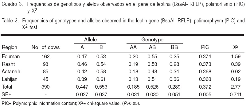 En el Cuadro 3 se presentan las frecuencias genotípicas y alélicas para el polimorfismo BsaAI-RFLP del gen leptina. Los resultados indicaron que la frecuencia del alelo B (0.553) fue la más alta en las cuatro regiones, mientras que la más grande y la más baja frecuencia genotípica fueron para AB (0.526) y AA (0.185).