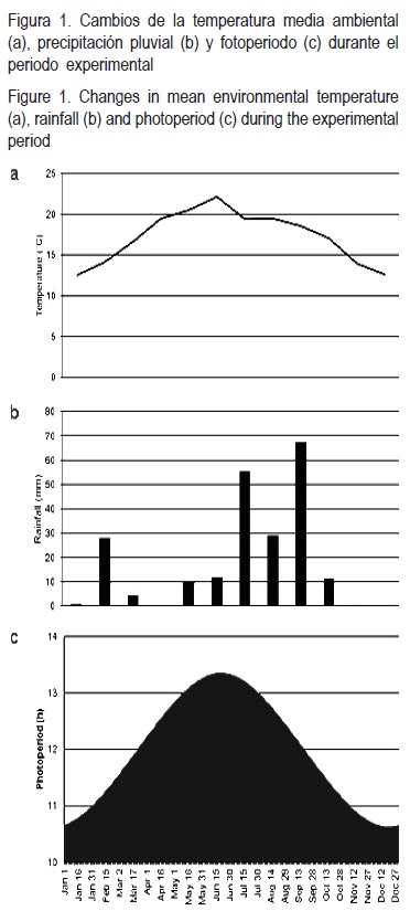 El estudio se llevó a cabo entre febrero y octubre de 2005, en el estado de San Luís Potosí, México (22° 14' 03" N, 100° 53' 11" R y 1,835 msnm). El fotoperiodo en esta zona varía de 13 h 22 min en el solsticio de verano a 10 h 38 min en el de invierno. El clima se clasifica como seco con una precipitación anual promedio de 285.9 mm, concentrada entre junio a septiembre. Las variaciones de fotoperiodo, temperatura media y precipitación pluvial ocurridas durante el periodo experimental se muestran en la Figura 1.