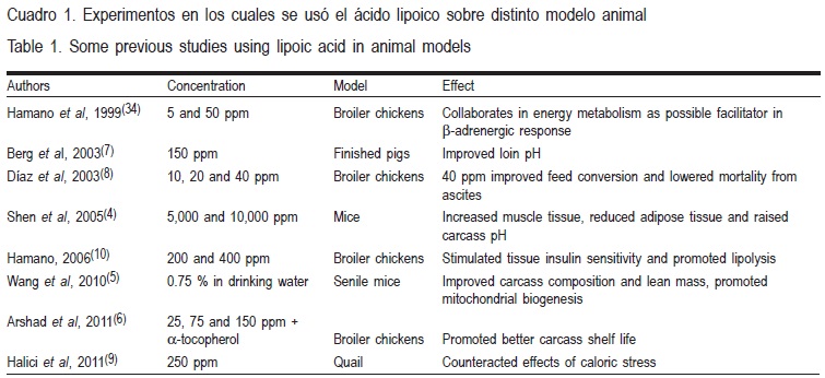 Durante los últimos 30 años, la selección avícola se centró en lograr aumentos en la velocidad de crecimiento de las líneas de carne; sin embargo, a consecuencia de esto se afectó negativamente el metabolismo del ave, su estructura muscular y la calidad de la carne(2). Además, se observó que las tasas elevadas de crecimiento pueden originar anormalidades morfológicas(2). Lo anterior, indica que las mejoras basadas en la selección genética tienen un límite que ya se está alcanzando, por ello los avicultores han optado por el uso de aditivos para mejorar la producción, tales como coccidiostatos, enzimas, saborizantes, antioxidantes, por mencionar algunos. Dentro de los antioxidantes se encuentra el ácido alfa lipoico (AAL), que es un ácido graso derivado del ácido octanóico que integra en su estructura dos átomos de azufre, los cuales le confieren varias de sus características particulares. El AAL participa como cofactor de dos complejos enzimáticos importantes en el ciclo de Krebs: la piruvato deshidrogenasa y la alfa-cetoglutarato deshidrogenasa(3).