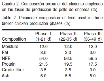 Los animales se alimentaron con un producto comercial (Pollo Sow de Nutri Sow®) en un esquema de tres fases, cada una con las características que se indican en el Cuadro 2. El alimento comercial se molió y fue colocado en una mezcladora donde se adicionaron las diferentes dosis de AAL; después el alimento mezclado se identificó y almacenó para proporcionárselo a las aves posteriormente.