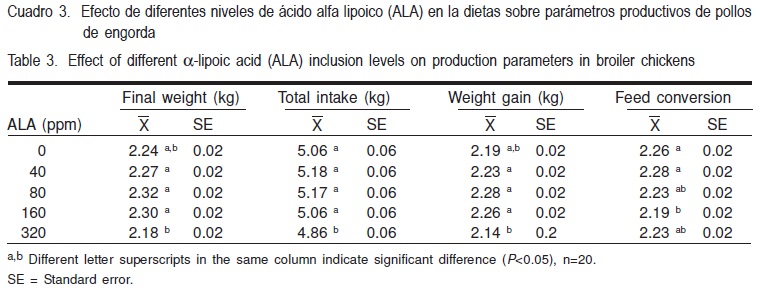 En el Cuadro 3 se observan las medias y el error estándar del peso final, ganancia de peso, consumo de alimento y conversión alimenticia en 49 días de evaluación. Respecto al peso final y la ganancia de peso, se puede observar que no existió diferencia entre los tratamientos 40, 80 y 160 ppm, sólo el nivel de 320 ppm de AAL mostró valores menores que el resto de las dosis, pero iguales al testigo (P>0.05). A su vez, el consumo de alimento fue menor (P<0.05) en los animales que recibían 320 ppm de AAL con respecto a todos los tratamientos incluyendo al testigo. En el caso de la conversión alimenticia se observaron algunas diferencias entre tratamientos, la dosis de 160 ppm presentó el menor valor, siendo diferente a los niveles de 0 y 40 ppm, pero igual al resto de los tratamientos (P<0.05). En los experimentos realizados por Berg et al(7) con cerdos, no se observaron efectos sobre el peso de la canal al adicionar ácido alfa lipoico en su dieta.