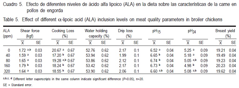 Broilers production has been employed various additives, including antioxidants that have played an important role in it. Within these products, alpha lipoic acid (ALA) has distinguished; its addition in the diet provides different benefits to the animals. Therefore, the objective of this study was to evaluate the productive performance and meat quality of broilers with use of ALA in different doses (0, 40, 80, 160 and 320 ppm). The experiment was divided into two phases, the first productive performance was evaluated using 1,000 birds that were divided into five treatments with 200 animals each; the duration of this test was 49 d. In the second phase the sacrifice of animals was performed, 20 samples were obtained by treatment and testing the meat quality of them. The results of the production and quality meat variables were analyzed in a completely randomized design. No significant differences (P>0.05) were found by the addition of ALA on productive variables; however, chicks receiving 40 ppm of ALA lost less water by cooking.