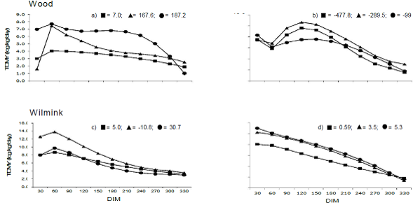 Parameters generated with the Wood and Wilmink functions need to be analyzed with caution. A number of authors claim that the occurrence of peak less lactation curves is mainly due to results produced from records with no data for the first days of lactation. For example, the notable presence of negative b parameter values refers to lactations with initial TDMY weighings at 30 d or more after parturition24. However, atypical curves are apparently not strictly linked to the day the first TDMY record is made33.
