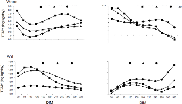 Average TDMY varied from 5.9 ± 3.3 to 3.7 ± 2.0 kg, with an overall mean of 4.9 ± 2.7 kg. Values for R2 A were >0.75 in 23 % of lactations using the Wood function, 24 % using the Wilmink function, 28 % with the Ali-Schaeffer function, and 36 % when using the Legendre polynomials function (Table 1). When R2 A curves >0.75 were selected, the three-parameter models identified four types of curves (Table 2). The Wood model identified more (61 %) standard curves than the Wilmink model (47 %).