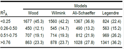 Table 1 Absolute frequencies and relative percentages (in parentheses) of fits in different classes of fitted coefficients of determination (R2A).