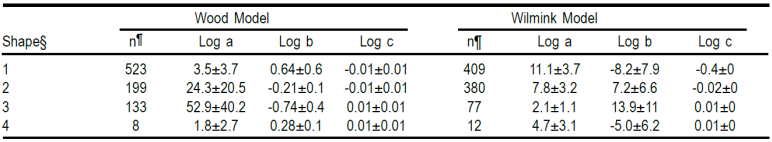 Table 2 Means and standard deviations of individual curve parameters classified according to the four shapes identified by the Wood and Wilmink models.
