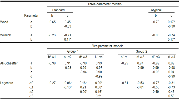 Of the correlations calculated between estimated parameters for the first two groups classified as typical and atypical curves with the Wood and Wilmink models, most were significant (P <0.05). Of the correlations for the first two groups classified using the Ali-Schaeffer and Legendre polynomials models, significant (P<0.05) correlations were found in all but group 2 of the Legendre curves (Table 5).